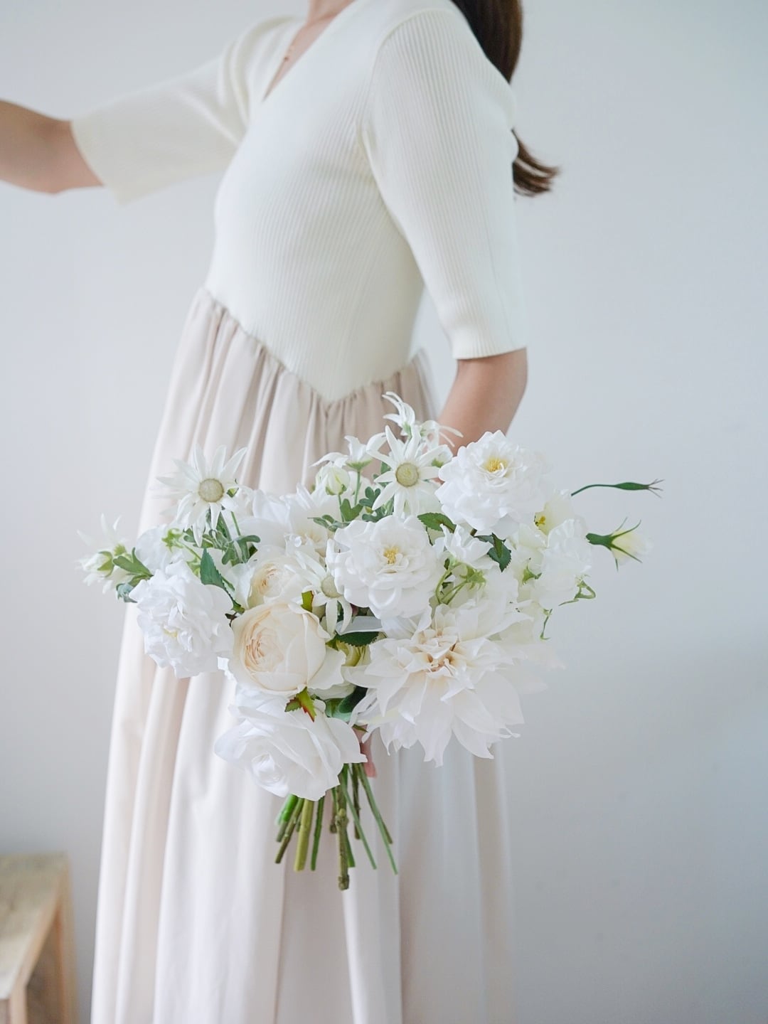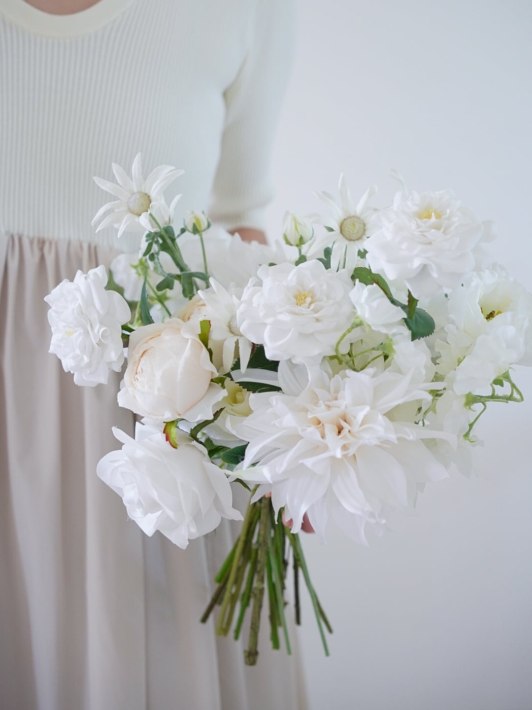 純白のダリアやローズを主役に、ふんわりと優しい花々で束ねたホワイトブーケ。