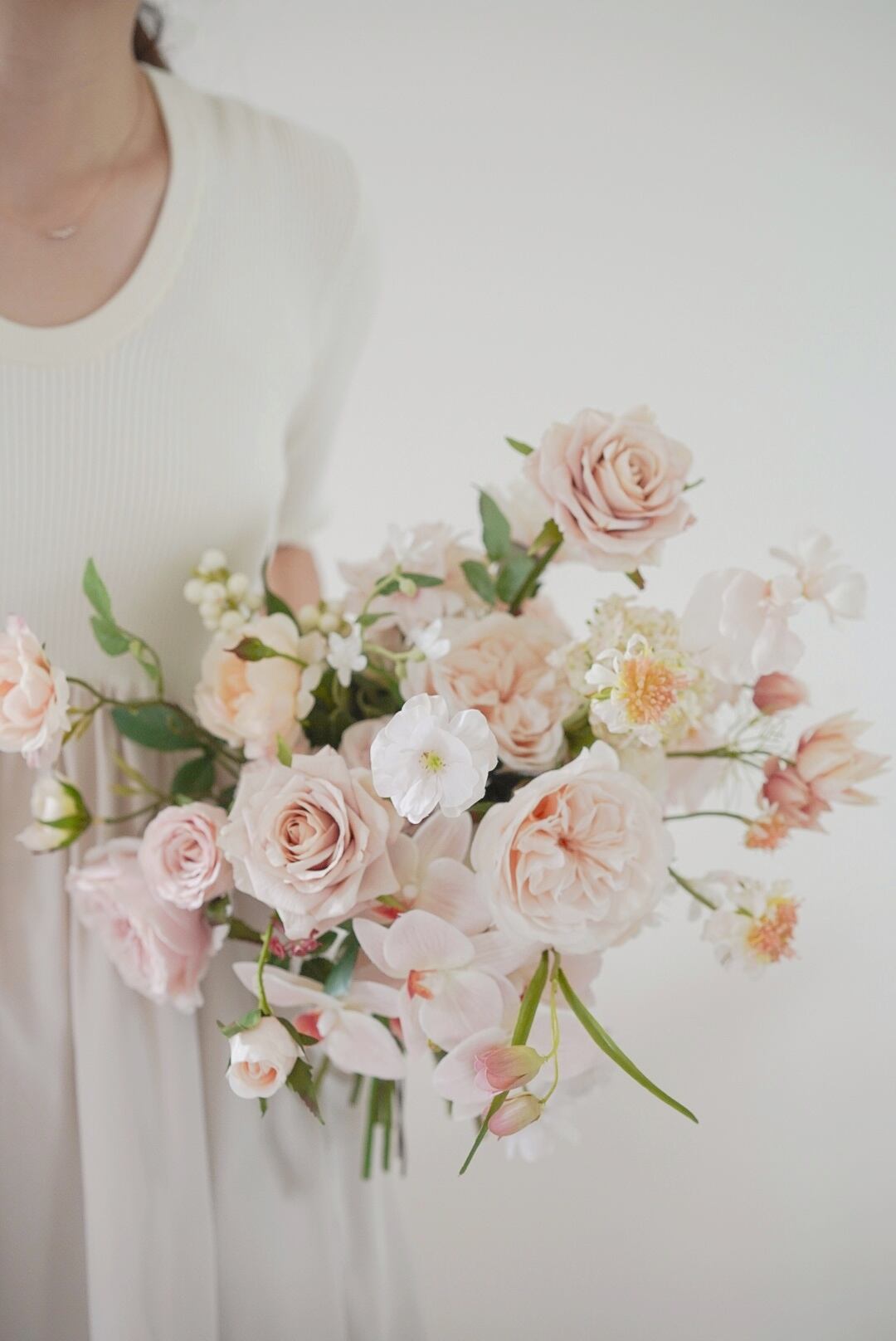 コチョウランやベリー、小花を重ねた、透明感と奥行きのあるニュアンスブーケ。