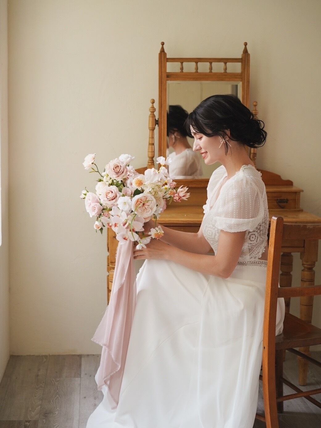 柔らかく肌に寄り添いながら、花嫁様の可憐さをそっと引き立ててくれます。