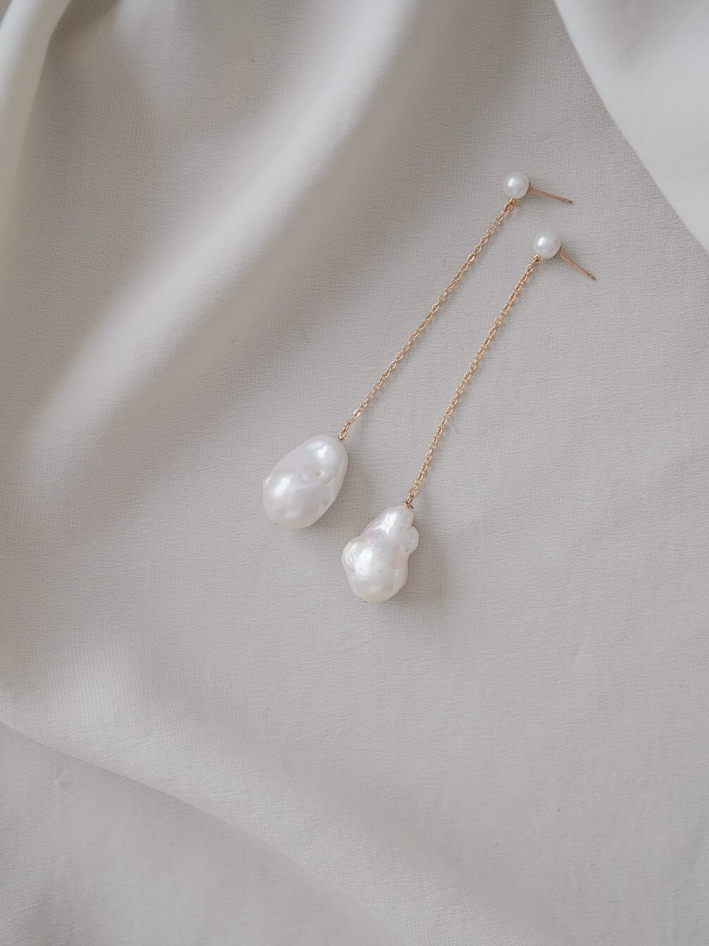 小ぶりのパールから揺れる、大粒のバロックパールをあしらったデザイン。