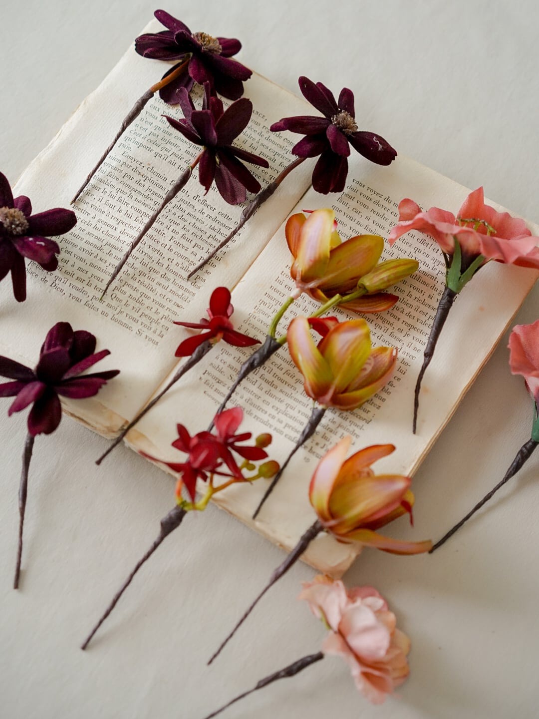チョコレートコスモス、ラナンキュラス、シンピジウム、ローズなど