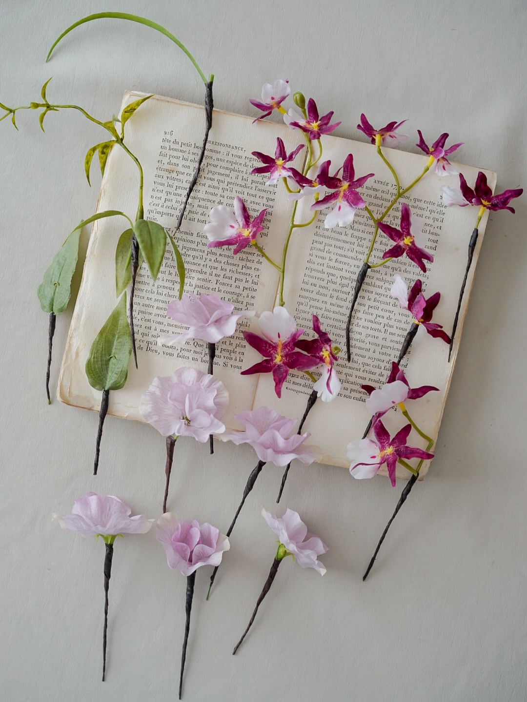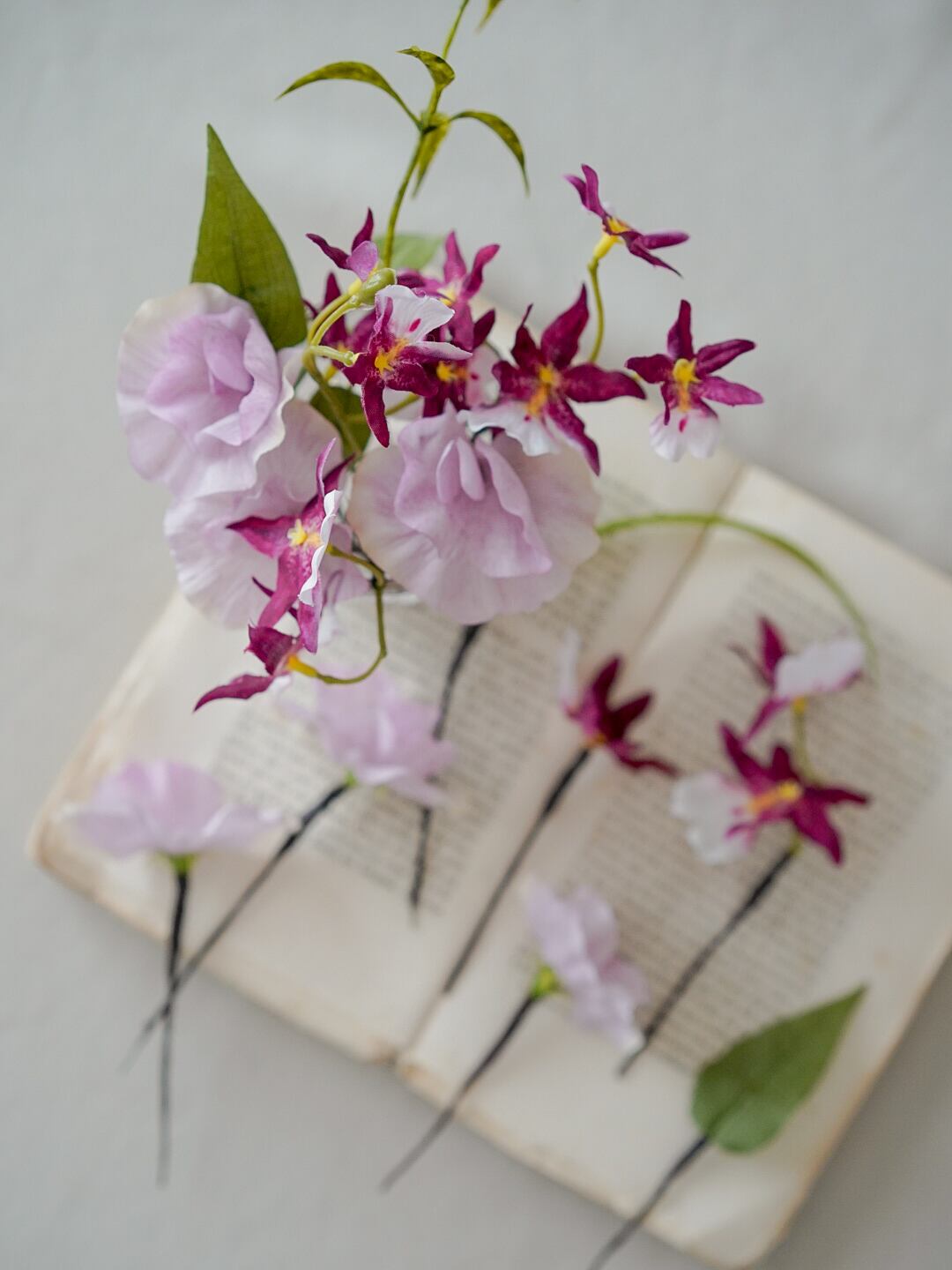 生花のような自然な美しさはもちろん、アレンジしやすいように茎を長めに残し、流れを活かしたお花を組み合わせてお作りしました。