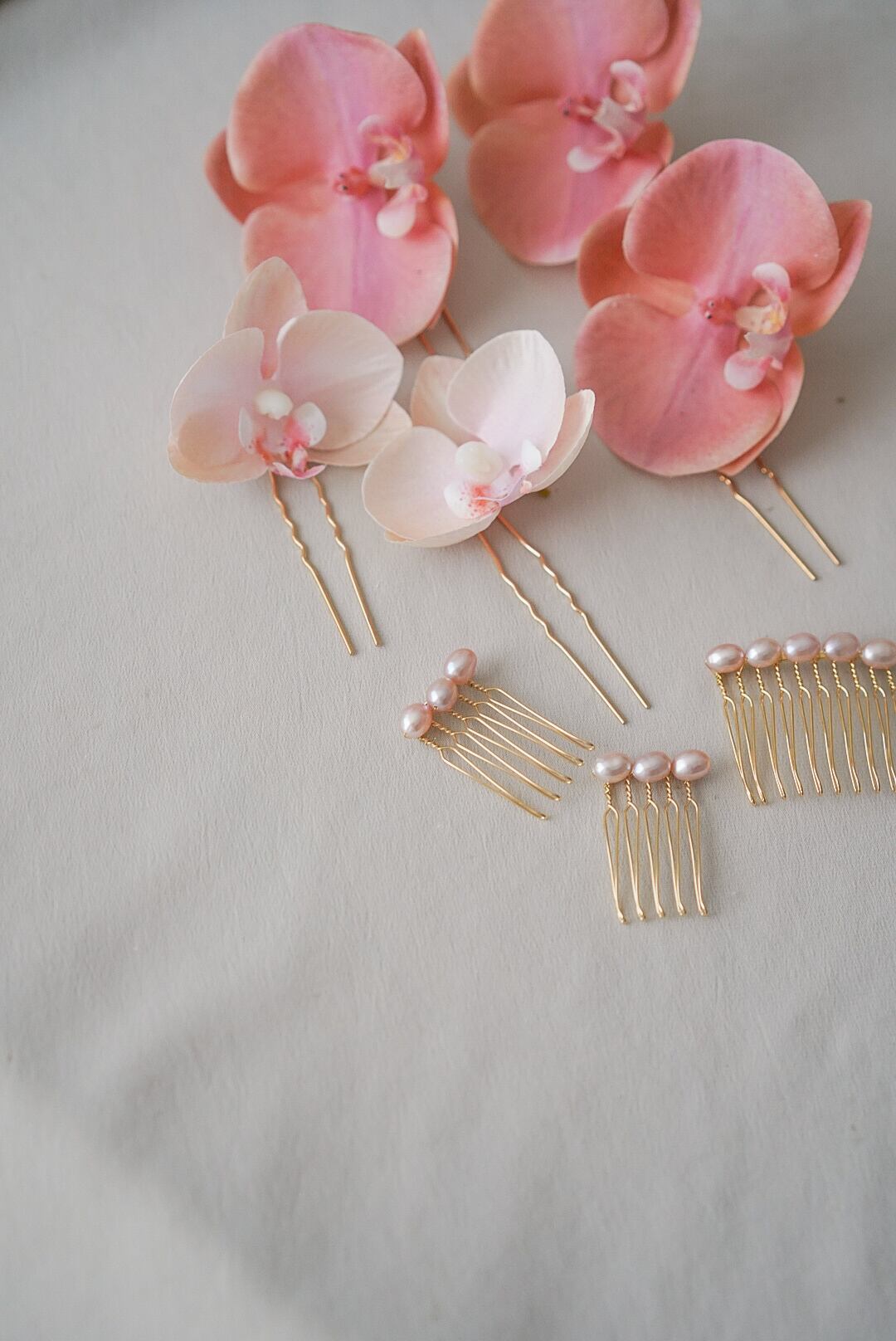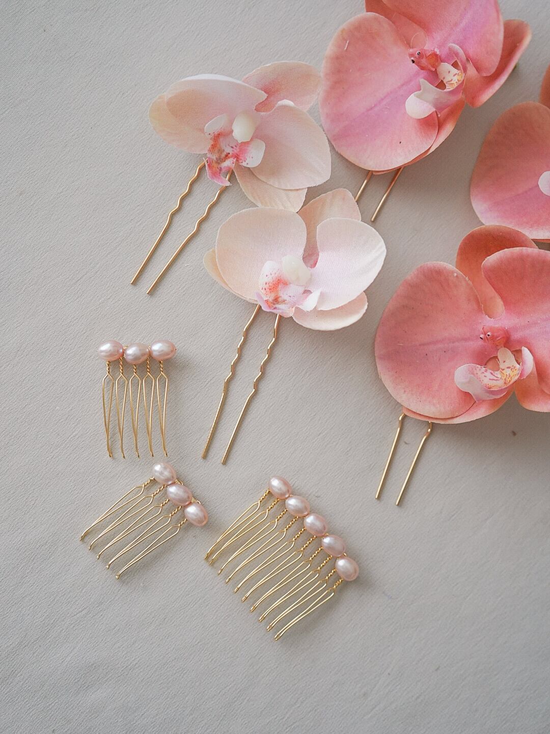 高級造花(アーティフィシャルフラワー)の胡蝶蘭と、天然パールを組み合わせたヘアアクセサリーセット。