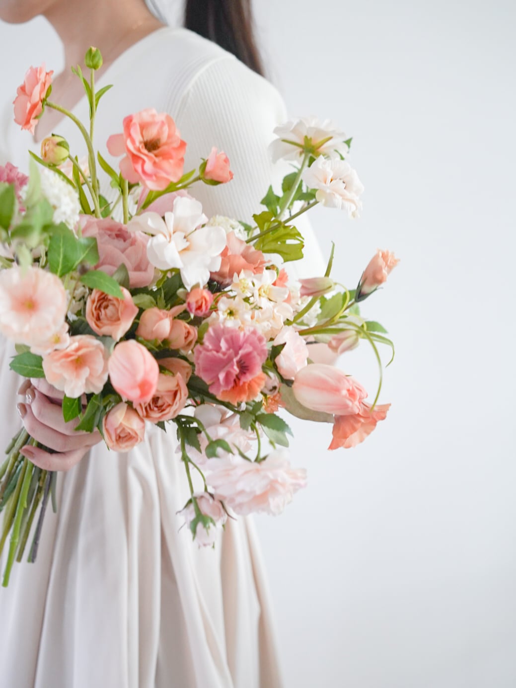 ラナンキュラス、ローズ、チューリップや小花をバランスよく重ね、