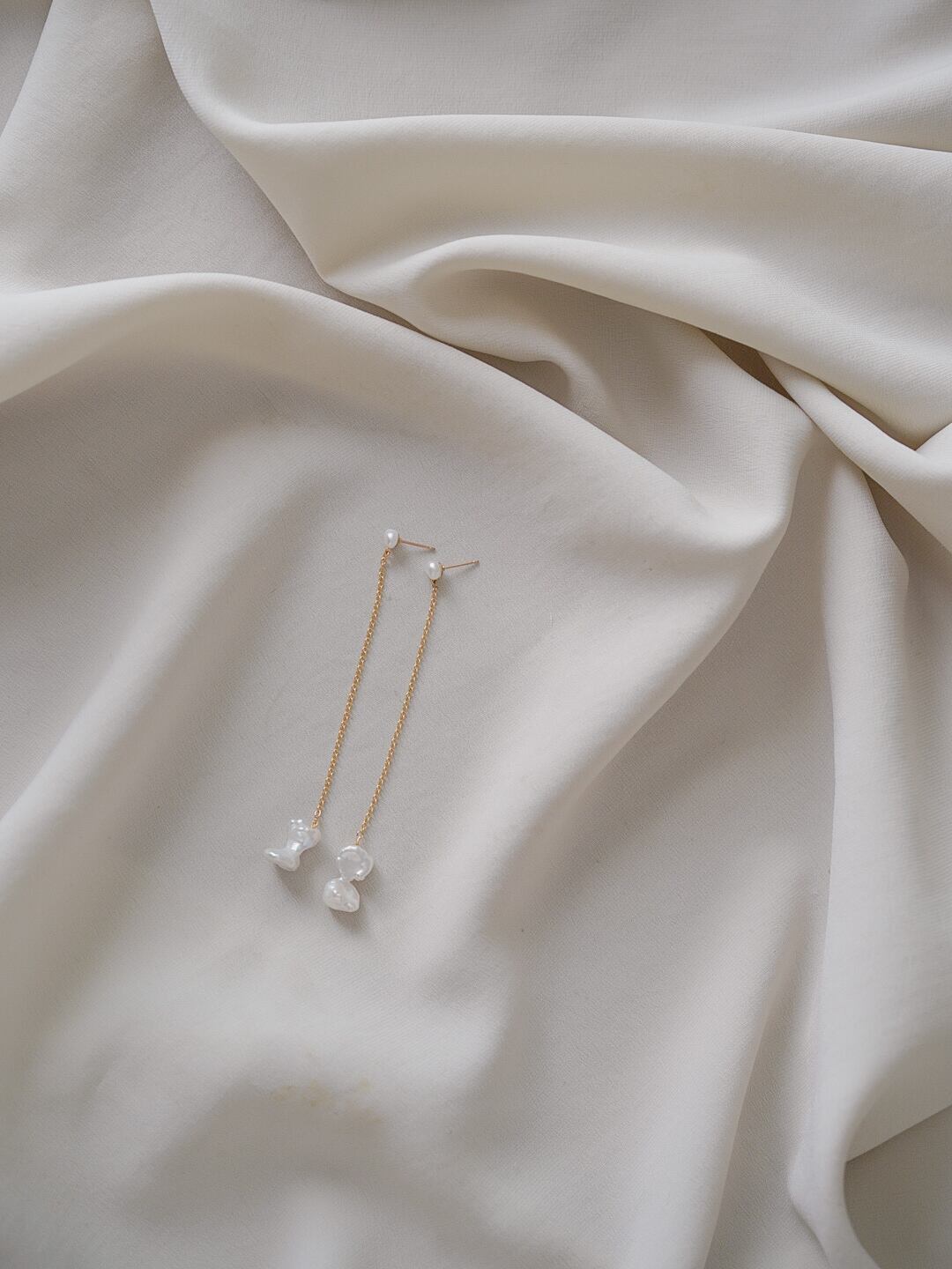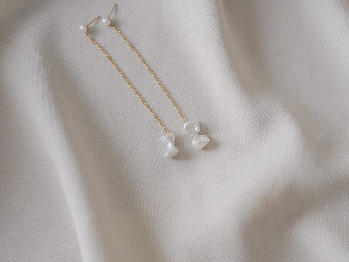 ころんとしたバロックパールをあしらったロングタイプのピアス/イヤリング。
