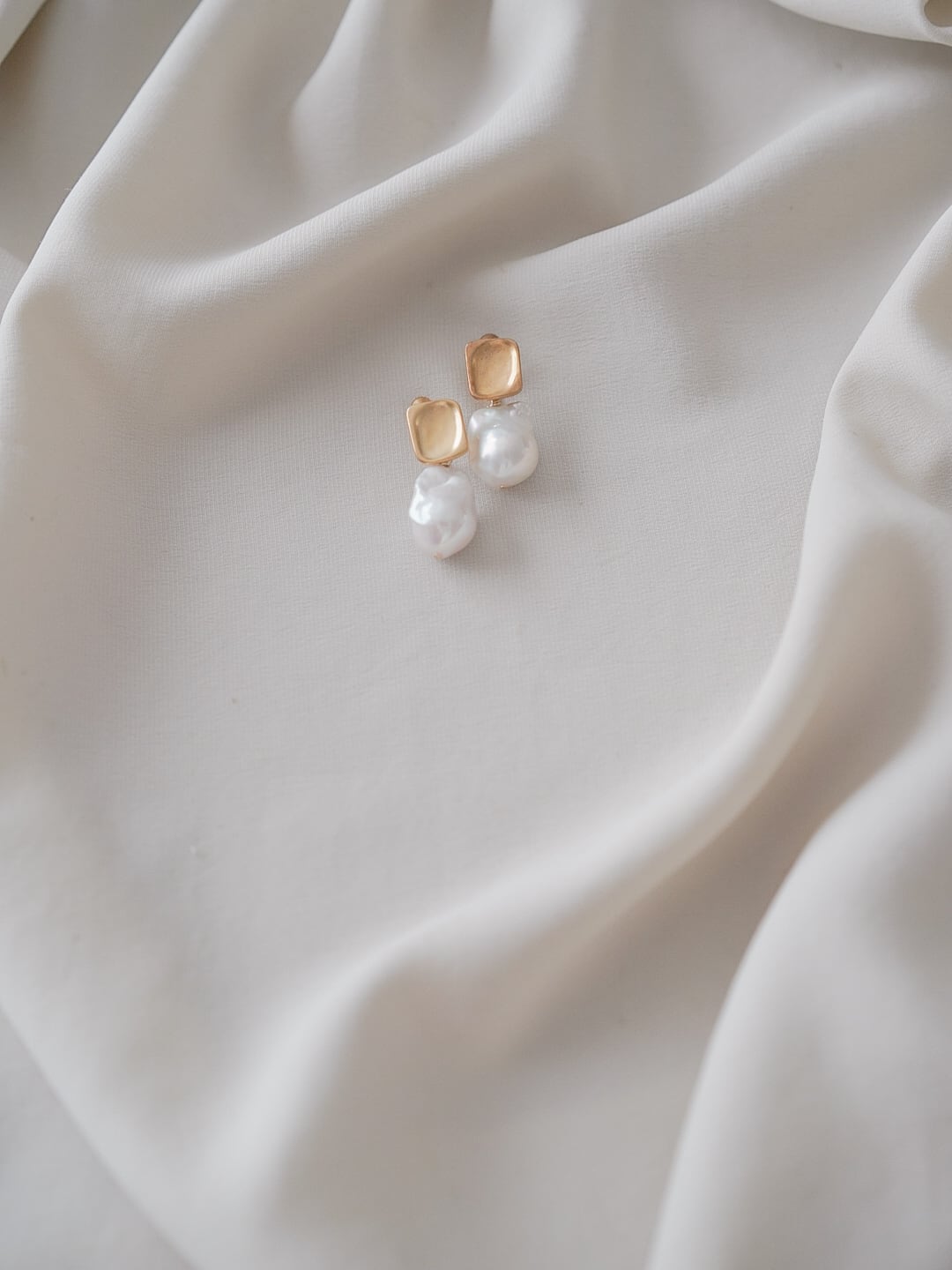 マット素材のゴールドに大ぶりのバロックパールを合わせて。
