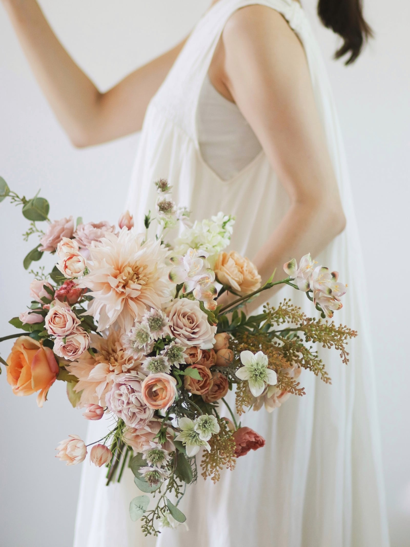 優しいニュアンスカラーの色合いにこだわったブーケ。