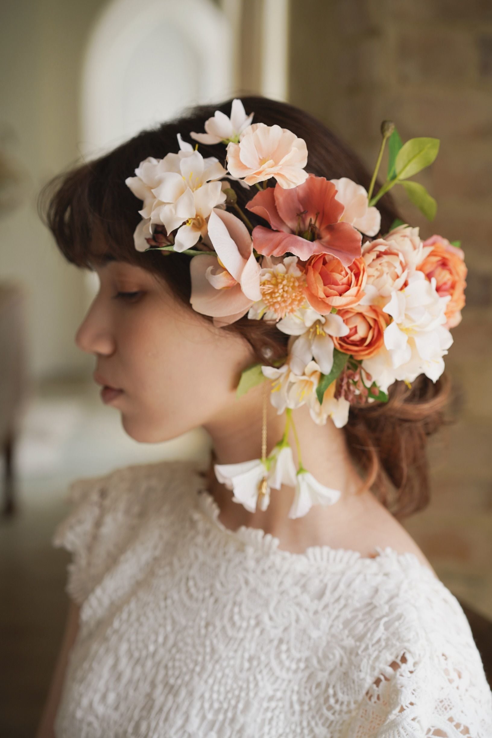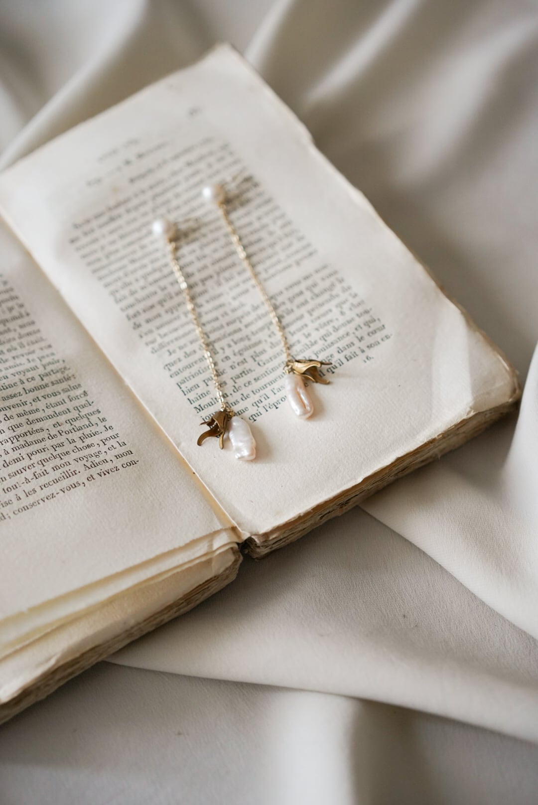 海外から取り寄せたお花モチーフの真鍮パーツと、スティック型のバロックパールを組み合わせたアクセサリー。